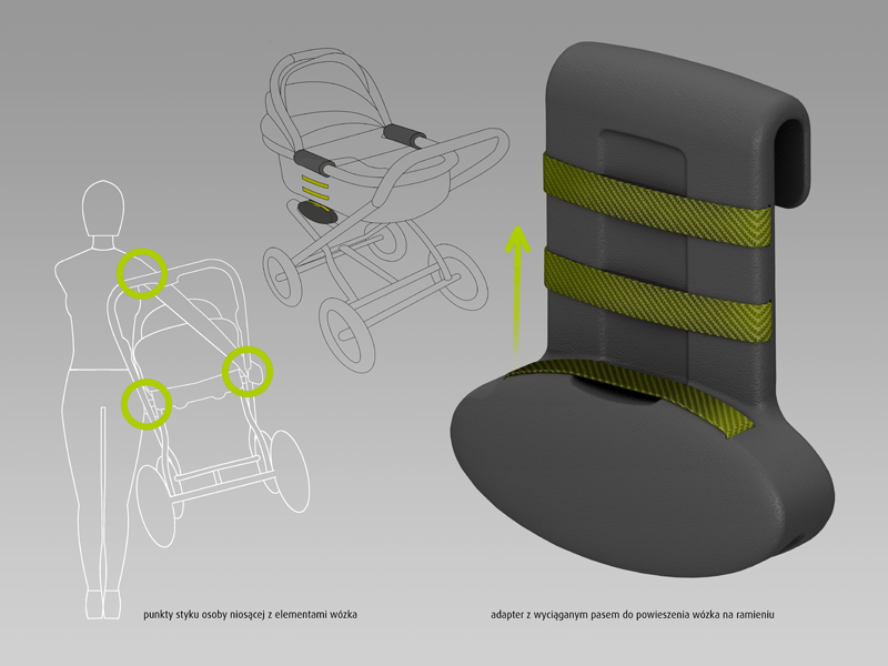Matka napotykając przeszkody w postaci schodów najczęściej transportuje wózek wraz z dzieckiem opierając gondolę na biodrze. Jest to czynność częsta i uciążliwa. Dodatkowo koła i elementy konstrukcji brudzą odzież. Element łączący gondolę z podwoziem został przeprojektowany w ten sposób, aby umożliwić opiekunowi przeniesienie ciężaru wózka na ramieniu, wsparcie go na biodrze i podtrzymywanie drugą ręką. Taki sposób przenoszenia zapewnia lepsze rozłożenie ciężaru, a jednocześnie oddala podwozie od nóg niosącego, co ułatwia przemieszczanie się i zabezpiecza odzież. Najważniejszą częścią urządzenia jest pas zawieszany na ramieniu. W pozycji spoczynkowej znajduje się zwinięty wewnątrz zaprojektowanego urządzenia. Zewnętrzna jego część opierająca się na biodrze jest wykonana z miękkiego tworzywa.