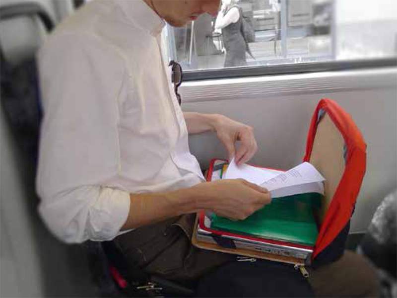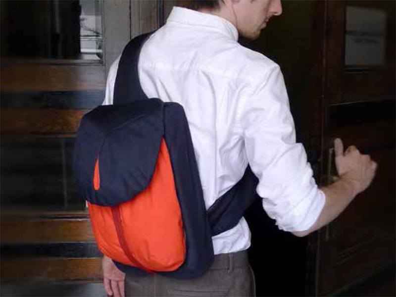 Posiada on z zewnętrznej strony sztywny blat roboczy. Mieści się w nim również łatwo dostępna kieszeń na dokumenty formatu A4 (1a). Połączony jest z nim pas (2) z systemem zapięcia (3) i uchwytem służącym do obsługi mechanizmu (4). Z pasem zintegrowana jest kieszeń na portfel i telefon (5). Druga strona pasa także jest połączona z głównym pojemnikiem. Została tak wyprofilowana, aby układać się po łuku na obojczyku i nie uciskać szyi. Do tej samej krawędzi przymocowana jest kieszeń na zasilacz (5) przylegająca do płaszczyzny zewnętrznego blatu roboczego. Istnieje również możliwość instalowania w tym samym miejscu dodatkowej kieszeni na rzeczy osobiste.