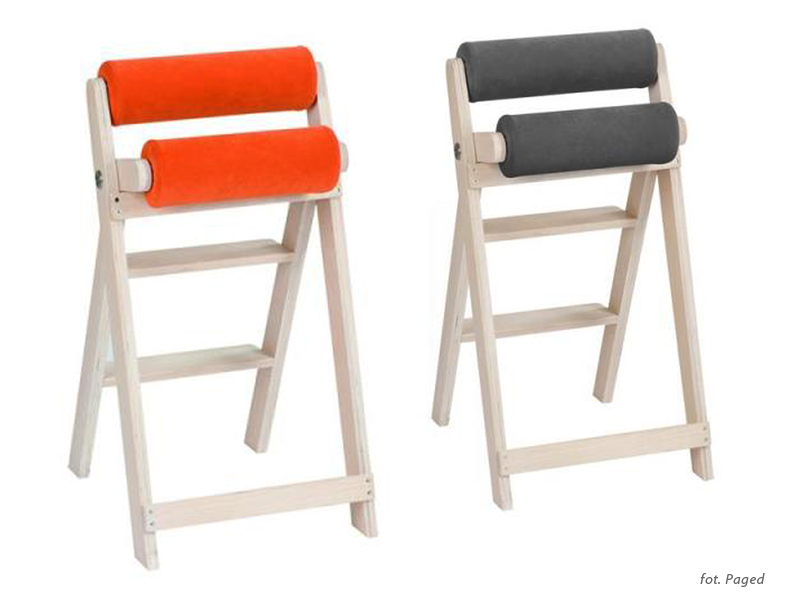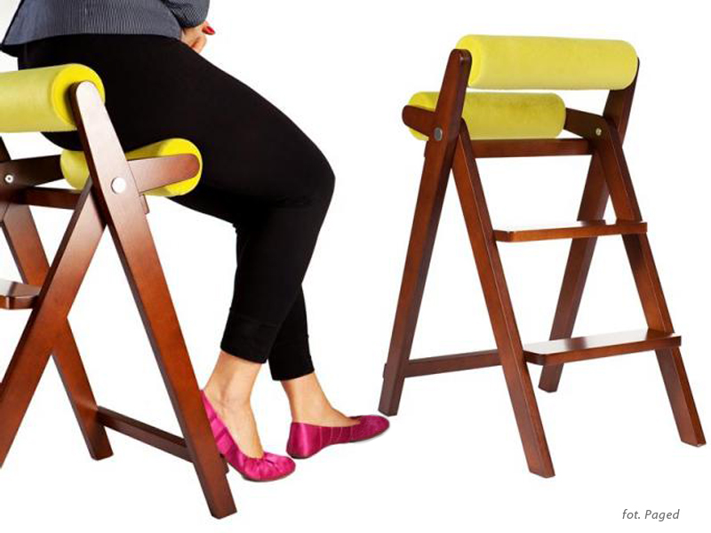 Projekt składanego siedziska kuchennego powstał na podstawie obserwacji i analizy problemów z jakimi borykają się osoby starsze podczas codziennych prac kuchennych. Przygotowywanie posiłków wymaga ciągłego ruchu i naraża osoby starsze na zbyt długie przebywanie w statycznej pozycji stojącej. Dwa wałki usytuowane na odpowiednio dostosowanej wysokości umożliwiają krótki odpoczynek w czasie prac kuchennych oraz szybką, a przede wszystkim łatwą zmianę pozycji, jak również komfortowe wykonywanie czynności na poziomie blatu w pozycji półsiedzącej lub półstojącej. Dwustopniowa drabinka spełnia funkcję dodatkową, zapewniając bezpieczny dostęp do wyżej usytuowanych miejsc bez konieczności wchodzenia na taboret czy przynoszenia drabiny. Dzięki składanej konstrukcji siedzisko można łatwo przenieść lub w razie potrzeby schować. Mebel zaprojektowany z uwzględnieniem technologii firmy Paged Jasienica.