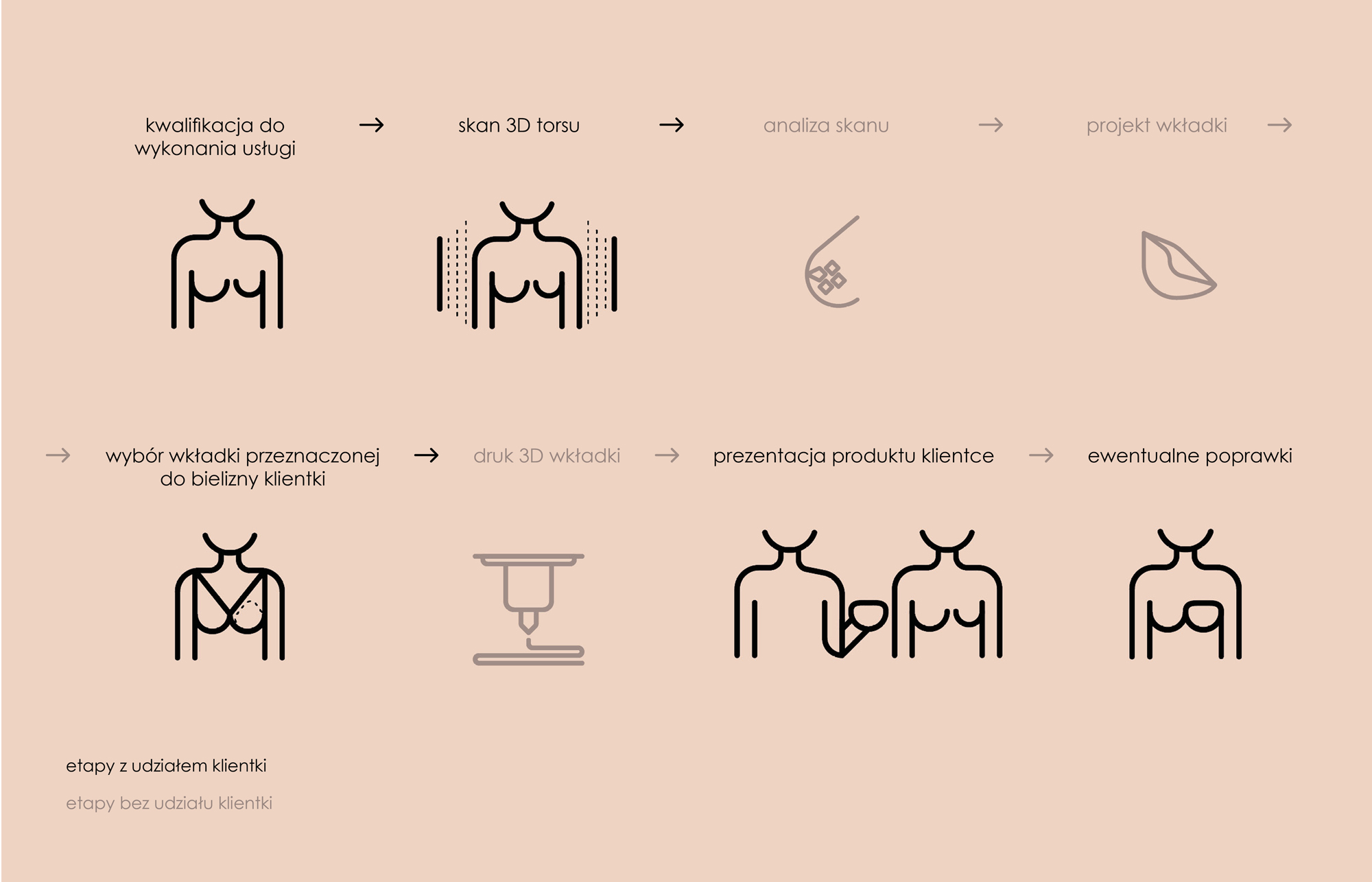 Dokonano analizy materiałów i technologii umożliwiających stworzenie wkładek imitujących nie tylko kształt, ale także gramaturę tkanek piersiowych. Wykorzystano technologię skanowania 3D do anatomicznego dopasowania wkładki. Ostateczny produkt miałby bazować na użyciu druku 3D z wykorzystaniem materiałów o odpowiednich właściwościach. Zaproponowano również model usługi obejmujący zarówno proces produkcyjny jak i bezpośredni kontakt z klientką.