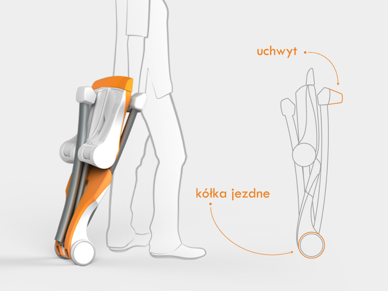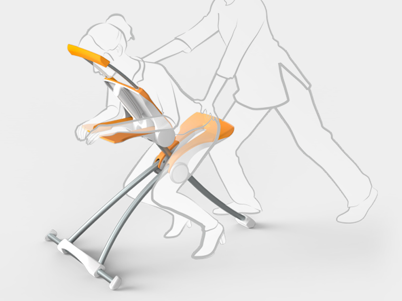 Mój projekt jest nowym spojrzeniem na sprzęt tego typu. Pozycja pacjenta uległa poprawie poprzez otwarcie kątów między poszczególnymi częściami ciała (niwelując m.in. ucisk narządów wewnętrznych) oraz rezygnując ze zbędnych punktów podparcia ciała. Zrezygnowałam także z niektórych regulacji, które okazały się zbędne i zawodne. W fotelu zastosowałam siedzisko siodłowe, które sprzyja zachowaniu naturalnej krzywizny kręgosłupa podczas siedzenia. Fotel opiera się na lekkiej konstrukcji z giętych profili wykonanych ze stopu aluminium. Na nich osadzone są części wykonane techniką wtrysku dwukomponentowego, z których jeden to miękkie żelowe wypełnienie, a drugi twardy element konstrukcyjny. Po złożeniu fotel przybiera spójną formę łatwą do przenoszenia. Wpisujące się w całość kółka ułatwiają transport sprzętu.