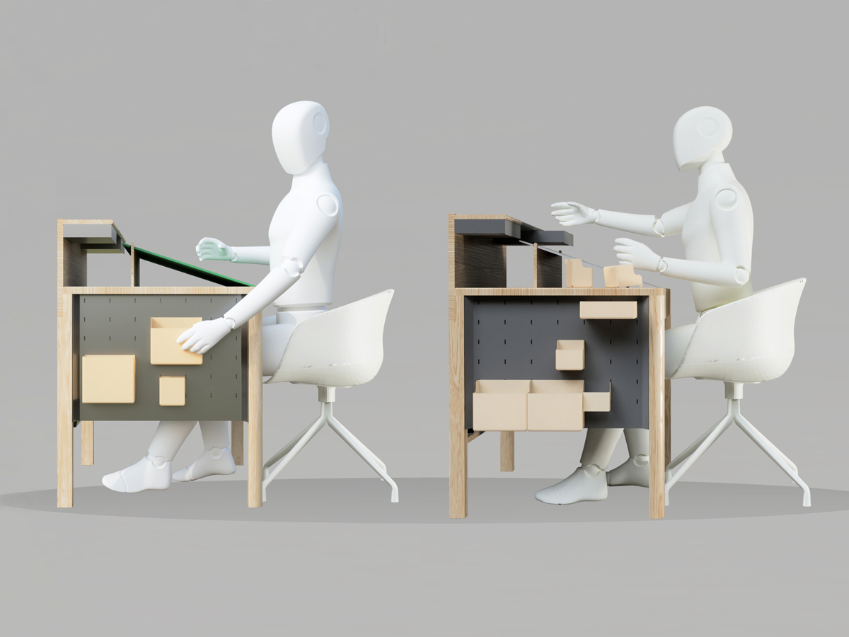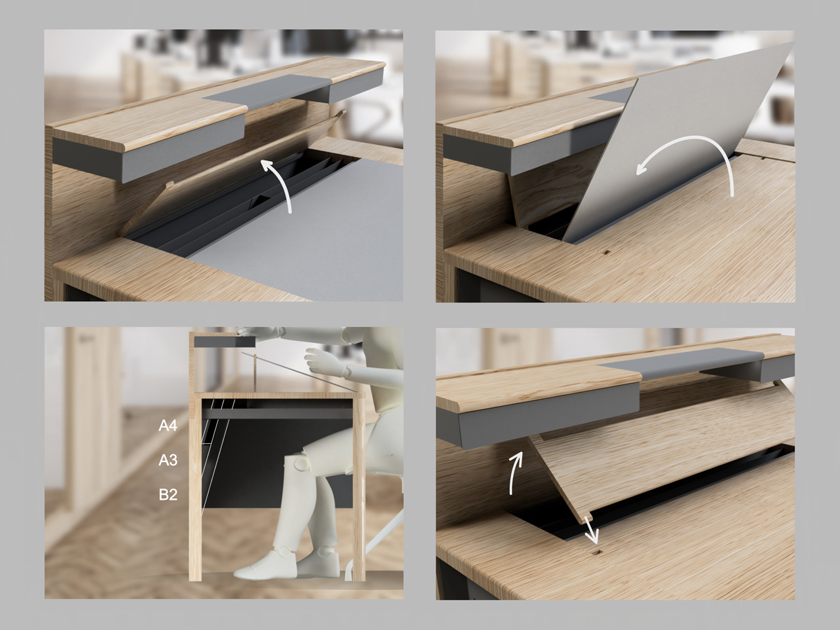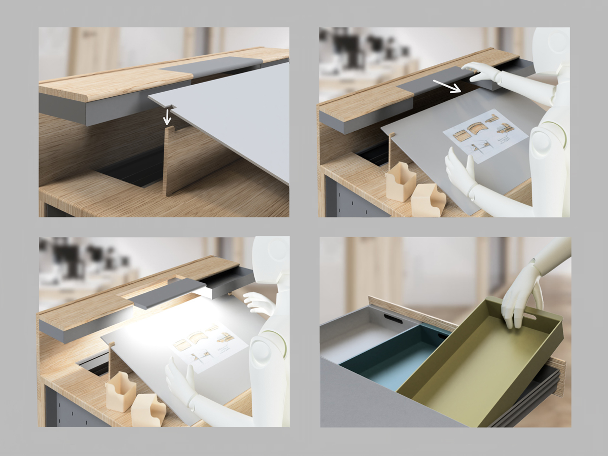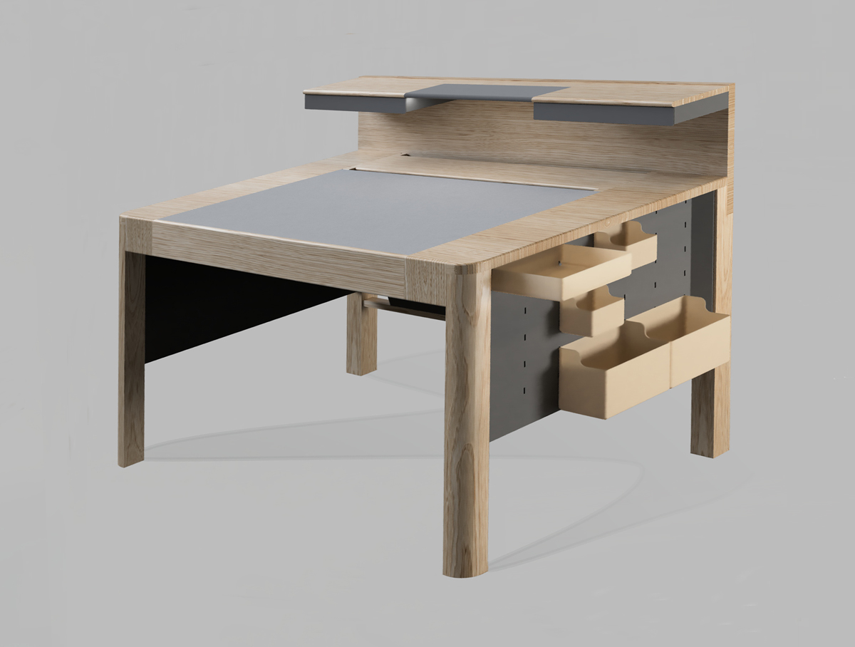 Biurko przeznaczone do projektowania komputerowego, rysunku odręcznego i do prac modelarskich. Składa się z drewnianego głównego blatu wspartego na czterech prostych nogach, nadbudowy z oświetleniem, metalowych ścian bocznych z ruchomym przybornikiem oraz schowka na arkusze. Zabudowane przestrzenie wewnątrz biurka oraz przenośne pojemniki umożliwiają przechowywanie niezbędnych przyborów i narzędzi w zasięgu ręki. Wbudowane wnęki znajdujące się pod blatem przeznaczono na arkusze o formacie 70x100 cm (papier, karton), które po ukończeniu prac można wsunąć przez otwór w blacie. Perforowana blacha stanowiąca boki biurka jest wyposażona w zawieszane pojemniki różnego formatu i kształtu, które można zawieszać w dowolnym układzie oraz przenosić na pulpit, tworząc indywidualne stanowisko pracy. Szuflada wysuwana spod blatu zawiera trzy wyjmowane przegrody przeznaczone na odpadki i ścinki, które z łatwością można opróżnić. Dodatkowo dla zachowania czystości podczas pracy, w środkowej części blatu można zamieścić wymienne podkłady, np. przy tworzeniu modeli arkusz do cięcia lub nieprzemakalne tworzywo przy rzeźbieniu w glinie czy plastelinie. Ze środkowej części blatu można utworzyć pochyły pulpit, ustawiając zasłonę otworu na arkusze w pozycji pionowej. Nad g wnym blatem znajduje się niska nadbudowa z centralnie umieszczoną wysuwaną płytą pod laptopa.