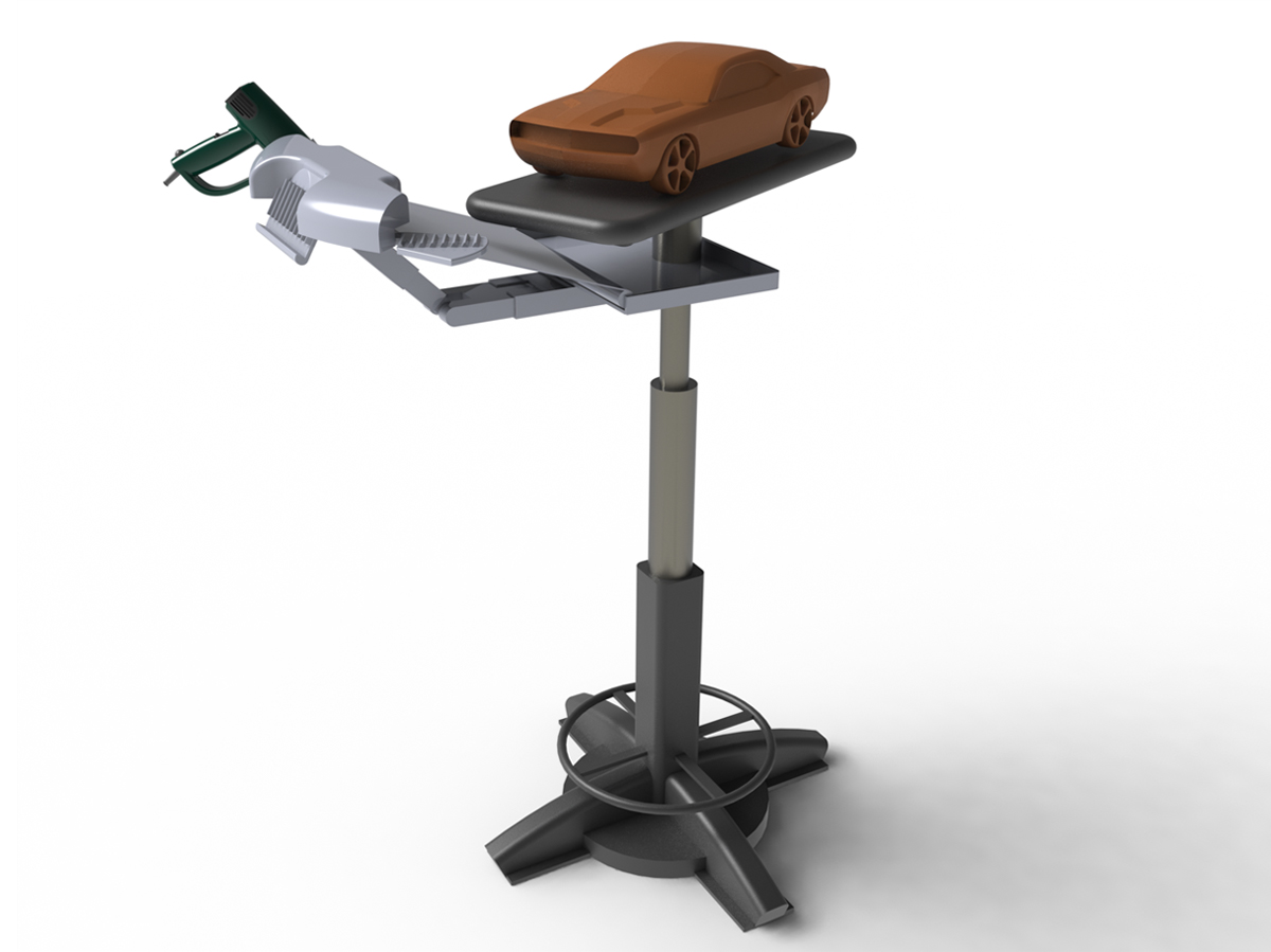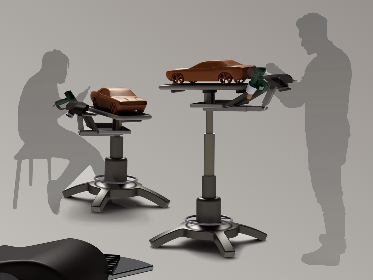 Projektowanie pojazdów, tzw. Automotive Design,wymaga pracy na modelach w skali,przy wykorzystaniu gliny. Proces ten pozwala na fizyczny kontakt z projektem i ułatwia pełniejsze zrozumienie formy budowanych kształtów. Projekt CLAW został wymyślony w celu zastąpienia prostego stołu warsztatowego, wykorzystywanego do rzeźbienia kształtu w glinie,na obiekt dedykowany,spełniający potrzeby użytkownika. Stanowisko posiada kluczowe udoskonalenia poprawiające ergonomię i organizację pracy modelarza. Kolumna teleskopowa o zakresie wysokości dopasowanym do skrajnych centyli użytkowników i rodzaju wykonywanej pracy. Narzędziownik na teleskopowym ramieniu,tworzący podpórkę pod ręce z wyznaczonym miejscem na narzędzia i nagrzewnicę. Pole robocze odpowiednie dla konkretnych wymiarów modelu,obrotowe, pozwalające na łatwą i szybką zamianę modeli na stanowisku. Fartuch ochronny rozciągany z rolki,zbierający skrawki gliny w obszarze stanowiska.