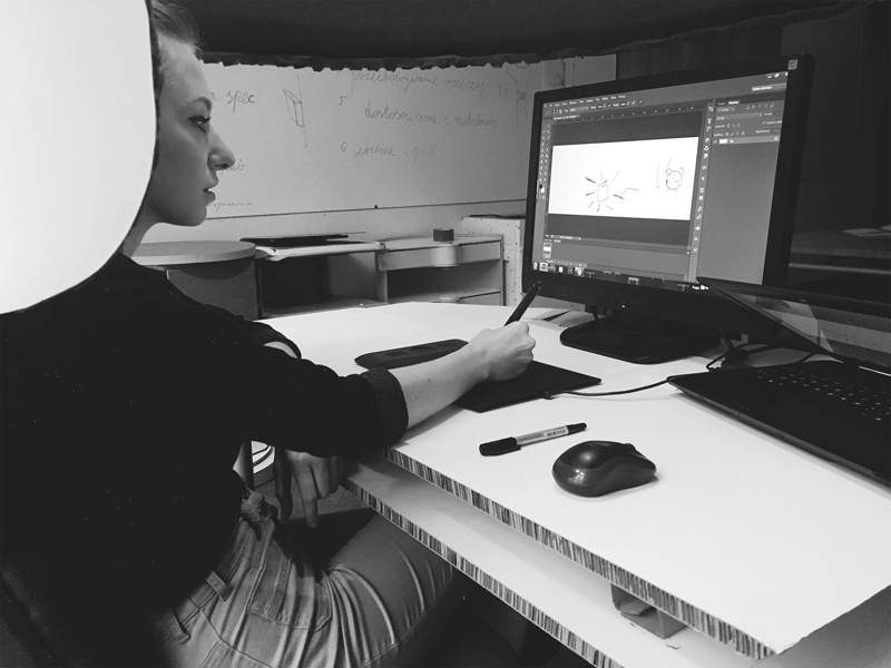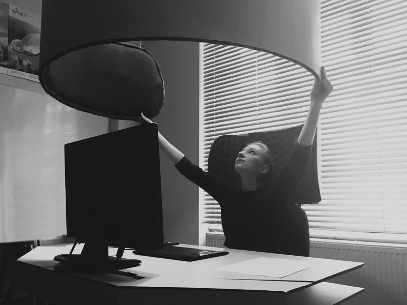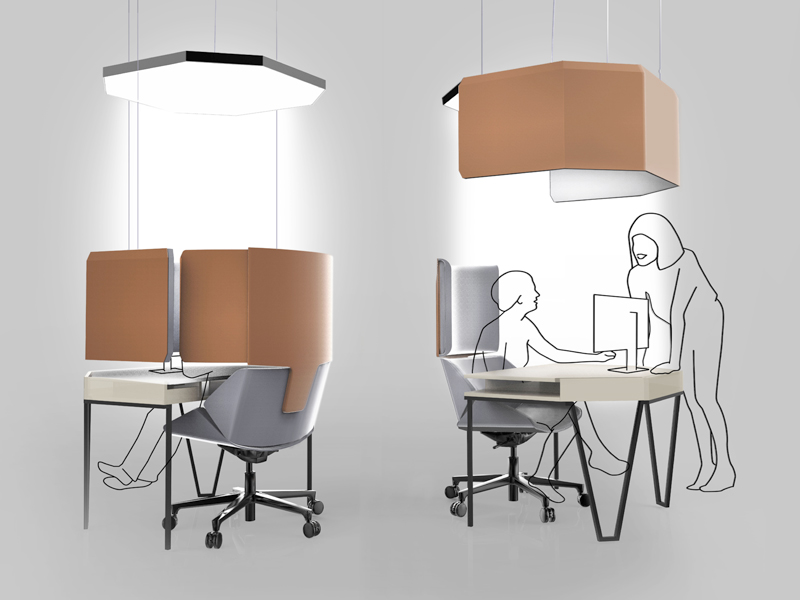 Na rynku pojawia się coraz więcej coworkingów lokalizowanych w przestrzeniach pofabrycznych. Duże powierzchnie i wysokie sufity powodują, że miejsce staje się głośne i uciążliwe, zwłaszcza gdy w grę wchodzą rozmowy telefoniczne na stanowisku pracy. Projekt powstał z myślą o grafikach i projektantach pracujących na dużym ekranie. Pozwala na wygłuszenie stanowiska przy jednoczesnym zachowaniu idei coworkingu - wzajemnej współpracy, wymiany doświadczeń. Projekt składa się z opuszczanego klosza, zagłówka, lampy - elementów znaczących akustycznie oraz biurka dostosowanego do potrzeb kreatywnych coworkerów. Dźwiękochłonny i dźwiękoizolacyjny klosz pełni również funkcję tablicy na notatki. Składany zagłówek osłania ekran zapewniając prywatność pracy. Biurko przez swój szczególny kształt pozwala na ciekawe ustawienie stanowisk względem siebie, integrujące coworkerów. Podwójny blat pomaga utrzymać porządek, oferując dodatkową powierzchnię na większe formaty papieru, listwę zasilającą i inne akcesoria biurowe. Projekt powstał we współpracy z akustykiem - inż. Bartłomiejem Chojnackim(AGH), studentką socjologii Barbarą Sporn (UJ) Przyjęta technologia uwzględnia potencjał produkcyjny firmy Fornit.