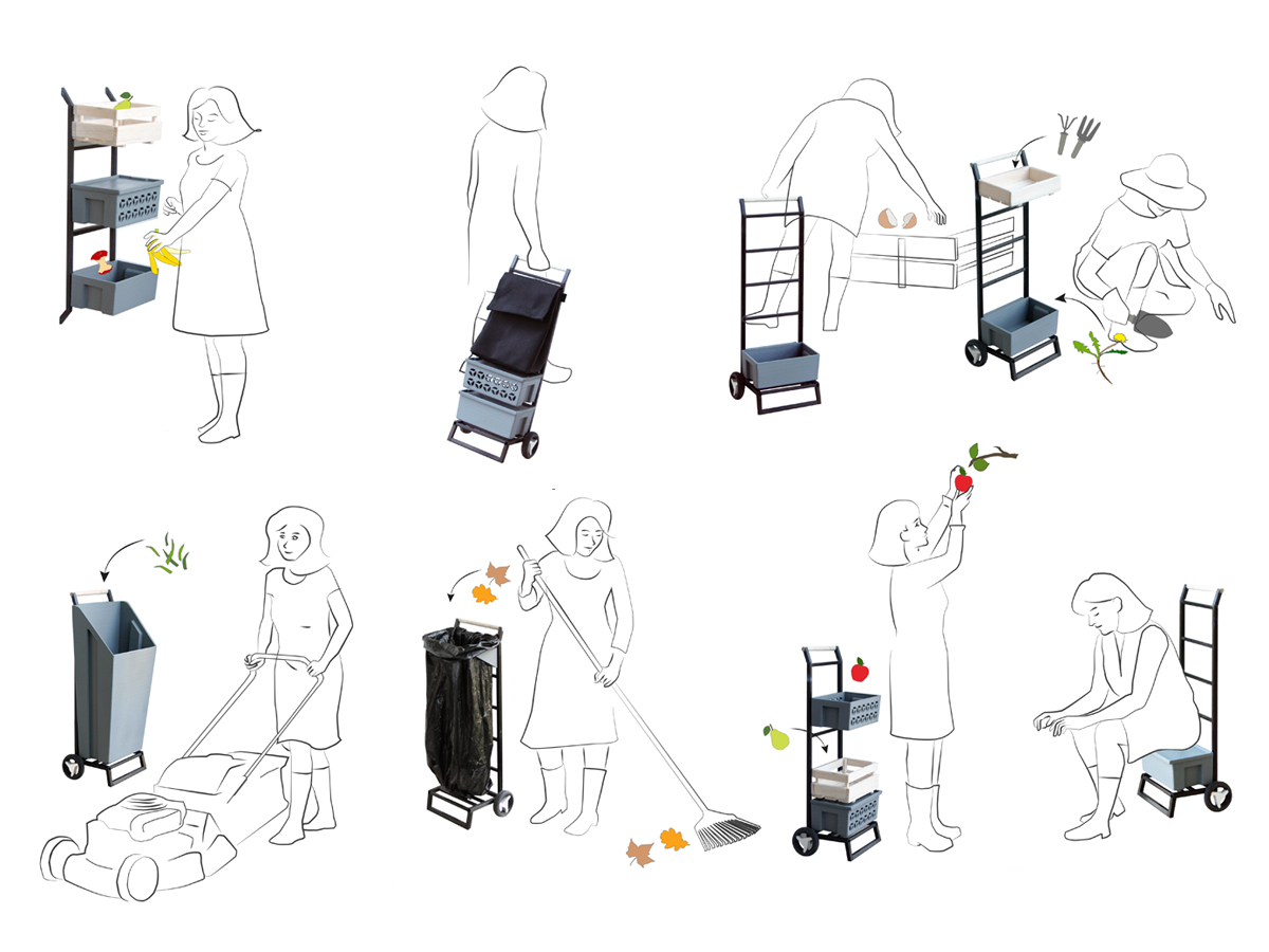 Rozwiązanie dla domu przewiduje konstrukcję, na której możemy zawiesić skrzynki i pojemniki przywiezione z działki. Do transportu na trasie dom-działka zaprojektowany został wózek. Pompowane koła oraz zwiększony prześwit pod wózkiem gwartują komfortowe poruszanie się w terenie. Szczelny pojemnik na odpady organiczne umożliwia bezproblemowe dostarczenie ich na miejsce kompostowania. Doczepienie do wózka płytkiej skrzynki z narzędziami oraz pojemnika na chwasty znacznie usprawni plewienie. Podczas koszenia trawy wózek może posłużyć jako kontener na odpady zielone, gdy przymocujemy do niego największy pojemnik. Doczepiana obręcz pozwala na zawieszenie worka na odpady . Przy zbieraniu owoców i warzyw wózek okaże się pomocny, gdy wybierzemy do niego zestaw ażurowych skrzynek. W chwili zmęczenia wózek może również przyjąć rolę siedziska. Zestaw dopełnia torba na zakupy lub inne przedmioty o większych gabarytach. Wózek bez pojemników doposażony w ekspandor może przewozić towary niemieszczące się do pojemników. Dla zwiększenia bezpieczeństwa wózek został wyposażony w zestaw odblasków.