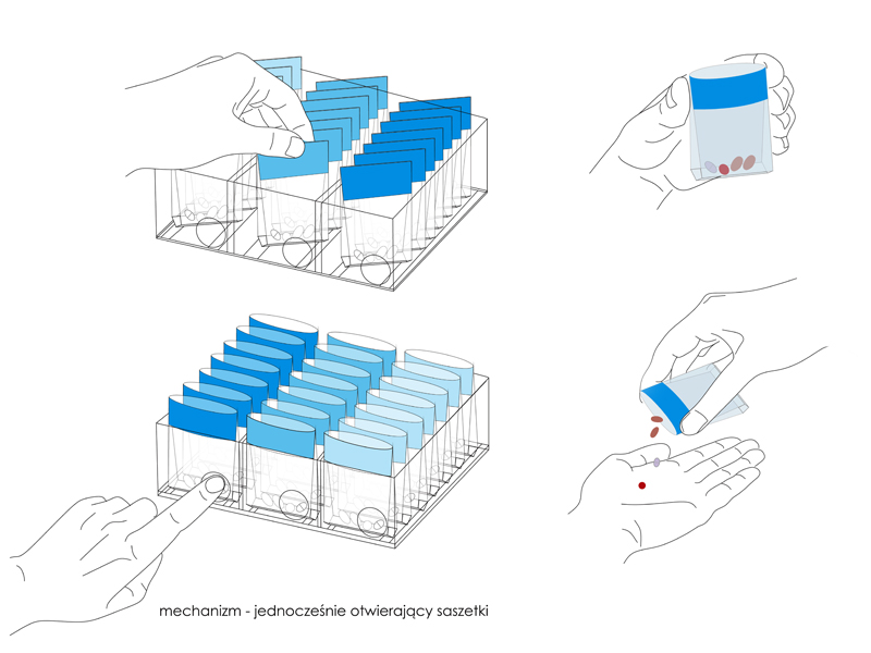 Opakowanie segreguje leki się na 7 dni tygodnia oraz na pory dnia. Wyciągane saszetki dają możliwość zabrania ze sobą potrzebnej ilości. Opakowanie z pokrywką zapewnia możliwość zabrania całości w podróż. Rozmiar saszetki pozwala zmieścić ponad 20 tabletek średniej wielkości. Pozmiar saszetek i opakowania pozwala sprawnie korzystać seniorowi z ograniczoną sprawnością rąk. Zamontowany mechanizm w opakowaniu zbiorczym pozwala na równoczesne otworzenie