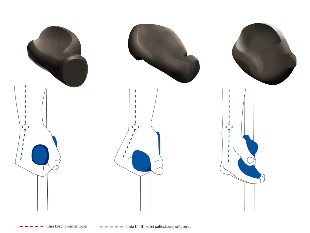 Uchwyt kuli ortopedycznej wpływa bezpośrednio na komfort oraz bezpieczeństwo użytkownika. Odpowiedni chwyt przekłada się na poprawną pozycję nadgarstka a w konsekwencji na całą sylwetkę pacjenta. Zaprojektowane przez nas uchwyty mają za zadanie utrzymywać nadgarstek w optymalnej pozycji zbliżonej do linii prostej pomiędzy drugą i trzecią kością paliczkową śródręcza a kością promieniową przedramienia. Odpowiednie ustawienie uchwytu względem kuli oraz jego właściwe ukształtowanie zapewnia optymalną powierzchnię styku dłoni z uchwytem i przełożenie nacisku głównie na kłąb kciuka i kłębik małego palca.