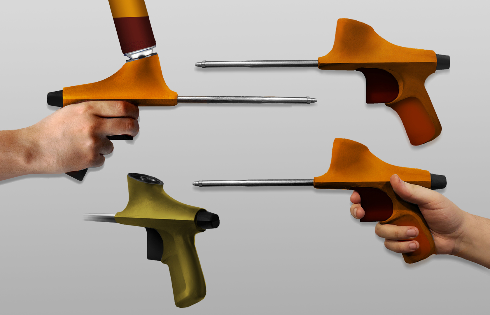 Projekt pistoletu do piany montażowej został oparty na zasadach kształtowania naturalnego. Bazując na formach tworzonych przez napięty między kluczowymi elementami konstrukcji materiał, powstał zarys całości obiektu, który w procesie projektowym przyjął syntetyczną finalną bryłę obudowy. Korpus urządzenia wraz z uchwytem tworzą jednolitą i jednorodną obudowę urządzenia. Uchwyt został ukształtowany bazując na chwycie naturalnym prawej i lewej ręki. Zapewnia dobrą stabilność i pełną kontrolę nad pistoletem. Spust po wciśnięciu dopełnia kształt uchwytu.