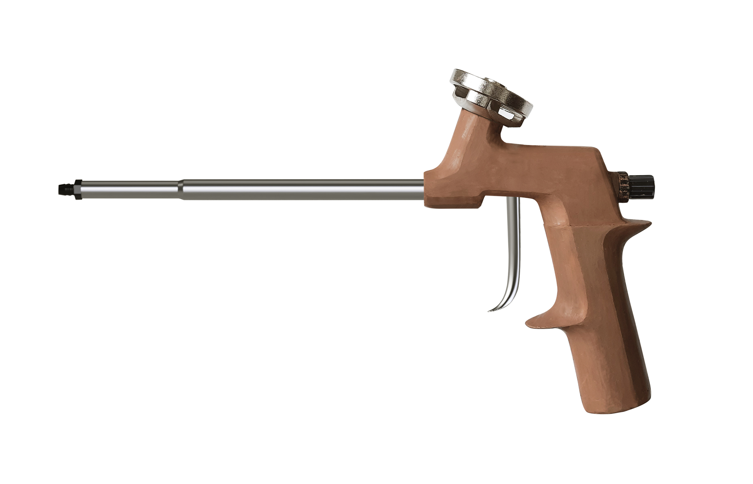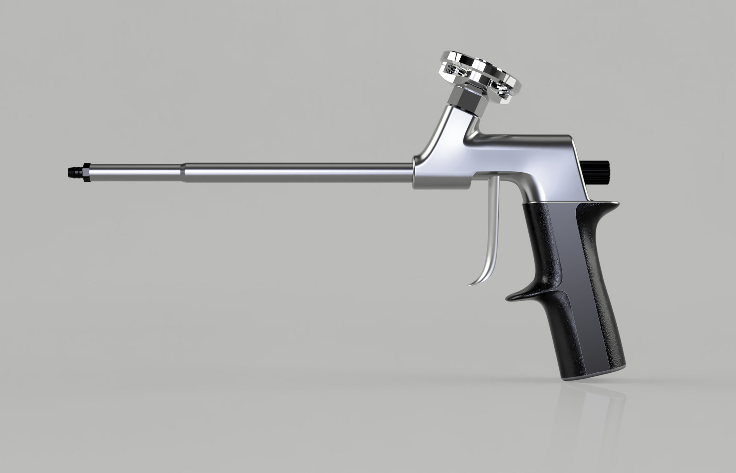 Projekt pistoletu do piany montażowej zrealizowany został jako praca semestralna. Głównym celem projektu było zaprojektowanie uchwytu, który będzie zapewniał komfortowy i stabilny chwyt przy długotrwałej pracy. Mechanizm spustu został ukryty w obudowie, zabieg ten zapewnia łatwość w czyszczeniu pistoletu. Projektując wzornictwo pistoletu opierałem się na zasadach geometrii oraz równoległości prostych. Wprowadzona kolorystyka i materiały (teksturowane tworzywo sztuczne i chromowany metal) dodają estetyczny wygląd i funkcjonalność produktowi końcowemu.