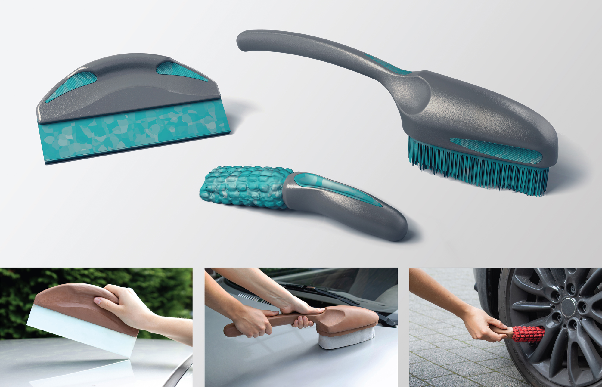 odpowiedniego chwytu i funkcji danego narzędzia, a także specyfiki ruchów wykonywanych podczas czyszczenia różnych powierzchni auta. W projekcie zwrócono uwagę na intuicyjność chwytu oraz możliwość użytkowania narzędzi w różnych warunkach, gdzie istotna jest pewność trzymania. Forma uchwytu szczotki zapewnia stabilność i pewny chwyt. Ściągaczka do wody daje kontrolę i płynność ruchu. Uchwyt szczotki do felg został opracowany z myślą o delikatnym, precyzyjnym czyszczeniu, co wymaga wygody i swobody manewrowania.
