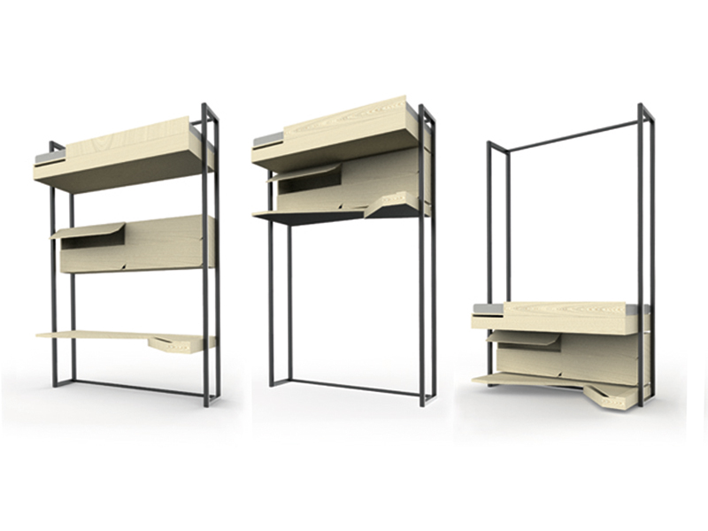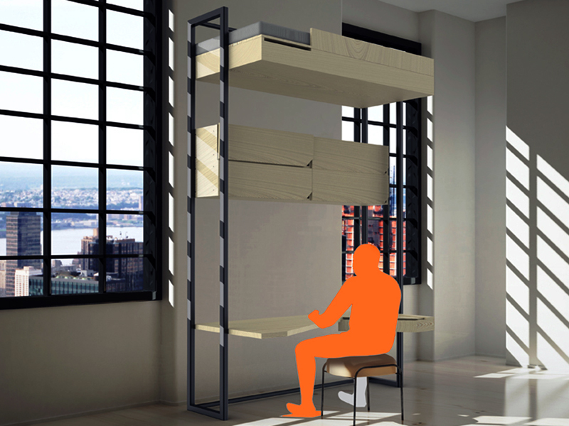 Projekt przeznaczony dla młodych osób mieszkających w pokoju o powierzchni około 10 m2. Mebel zapewnia wygodny sen, komfortową pracę/spożywanie posiłków oraz składowania najpotrzebniejszych rzeczy. Konstrukcja składa się z dwóch ram umożliwiających ruch mebli w kierunku pionowym. W czasie dnia łóżko znajduje się przy suficie, a stół i regał dostosowane są do właściwej wysokości pracy i zasięgu. Na noc stół i regał przesuwane są na poziom podłogi, a łóżko na poziom 80 cm. Możliwe jest również przesunięcie wszystkich mebli tak, aby zwolnić miejsce na podłodze. Jeśli układ pokoju pozwala, możliwe jest dobudowanie szafy wykorzystując tę samą zasadę konstrukcyjną. Taka ruchomość mebli pozwala na wykonywanie komfortowo każdej czynności z zachowaniem maksymalnej kubatury wnętrza.