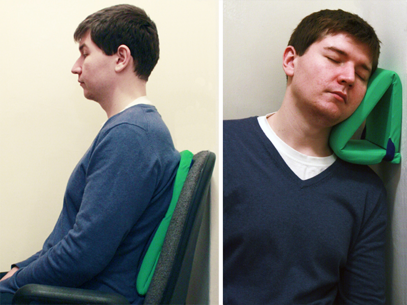 Projekt poduszki składanej odpowiada na istniejący problem związany ze snem podczas wielogodzinnej podróży autobusem. W rozłożonej formie może służyć, jako podparcie pod lędźwie, dzięki czemu pozwala zmienić pozycję pleców. Ułatwia ona również sen, gdy w autokarze posiadamy miejsce przy oknie. Dzięki silikonowym, antypoślizgowym elementom poduszka nie zsuwa się z szyby, tak jak w przypadku, gdy podłożymy pod głowę sweter czy zwykłą poduszkę. Wewnątrz znajduje się sztywna, ażurowa konstrukcja, utrzymująca formę poduszki. Projekt może być wykonany w technologii wtrysku dwukomponentowego, składającego się z miękkiej pianki oraz sztywnej konstrukcji.