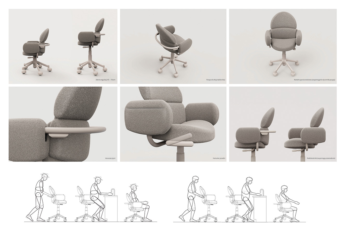 Projekt fotela ma na celu wydłużenie okresu samodzielności seniorów z ograniczeniami kończyn dolnych w warunkach domowych. Jest przeznaczony dla osób starszych potrzebujących wsparcia w codziennym funkcjonowaniu, dla których tradycyjny wózek inwalidzki okazuje się niedostosowany do mieszkań. Do najczęstszych problemów należą: blokowanie się wózka między meblami, niekomfortowa wysokość blatów kuchennych czy brak możliwości dosięgnięcia do górnych półek – wszystko to ogranicza niezależność i obniża komfort życia. Fotel wyposażono w regulację wysokości w zakresie 45–70 cm, co pozwala na przyjmowanie zarówno pozycji półstojącej, jak i standardowej siedzącej. Jego konstrukcja oparta jest na pięcioramiennej podstawie z kółkami wyposażonymi w hamulce. Z tyłu znajduje się uchwyt pełniący funkcję balkonika, a przesuwne podłokietniki ułatwiają przesiadanie się, np. na łóżko. Mechanizmy regulacji zostały ukryte w konstrukcji, dzięki czemu całość zachowuje domowy, meblowy charakter. Projekt ten zapewnia inkluzywność poprzez dyskretne wsparcie techniczne, wzmacniając niezależność użytkownika i podtrzymując jego poczucie godności.