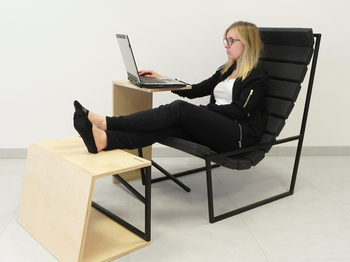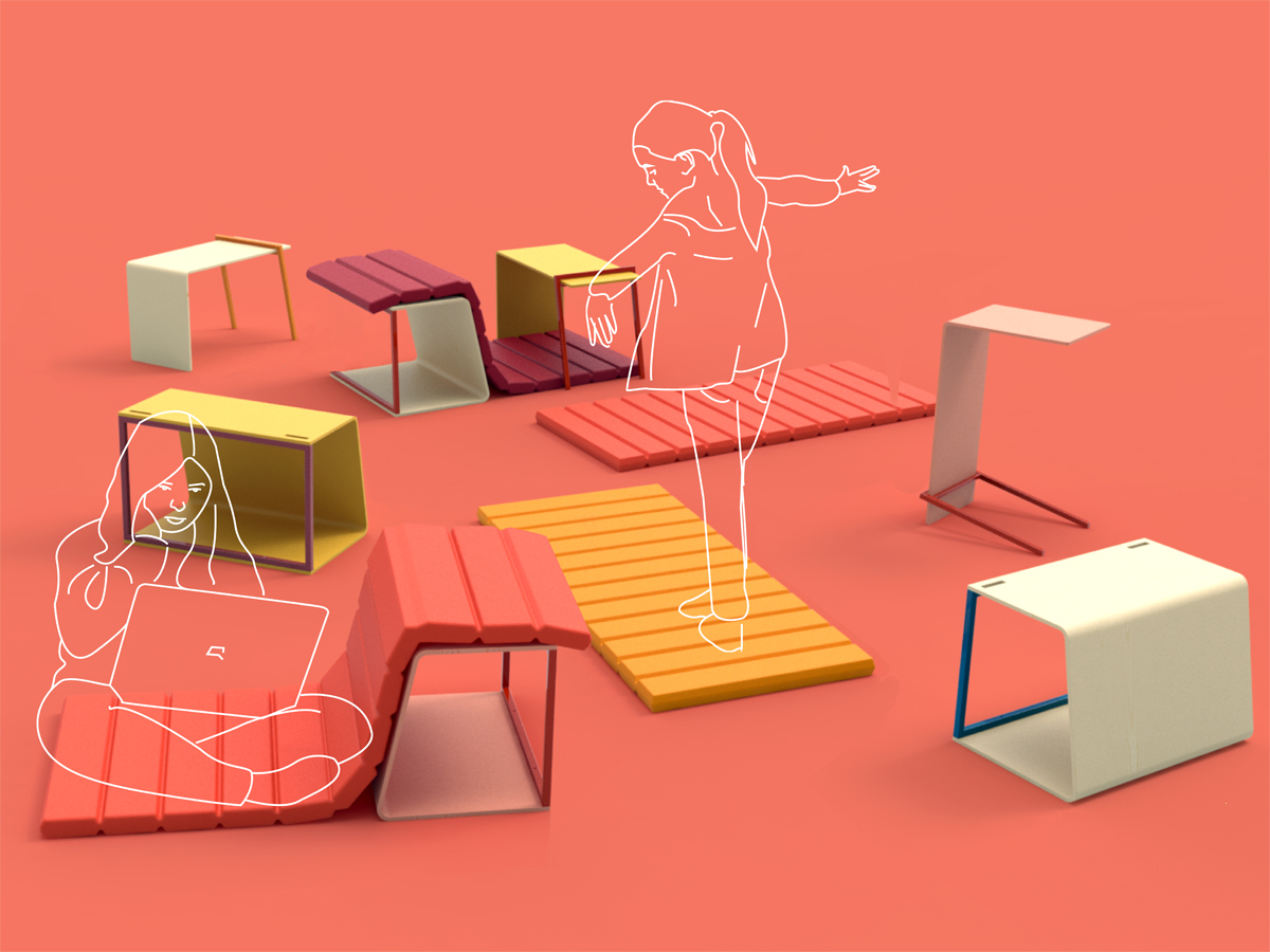 "Qbik" – projekt zestawu mebli – dedykowany jest do pracy w zmiennych pozycjach w przestrzeniach publicznych, takich jak biblioteki, uczelnie, galerie, czy biura coworkingowe. Projekt powstał na bazie obserwacji oraz rozmów i ankiet z pracownikami zdalnymi oraz studentami, którzy coraz chętnie wybierają i adaptują przestrzenie publiczne na miejsca pracy. Analizując rynek można zauważyć rosnące zainteresowanie niniejszym problemem, jednak większość powstających projektów nie odpowiada w pełni na istniejący problem. Zaprojektowane rozwiązanie, składające się z siedmiu elementów (materaca, fotela,trzech stołów, ławy i przesłony), umożliwia pracę w zmiennych pozycjach: siedzącej, stojącej i półleżącej. Zapewnia także komfortowe warunki pracy samodzielnej oraz w grupie. Każdy z poszczególnych elementów może być użytkowany osobno lub w dowolnych zestawieniach w zależności od potrzeb użytkownika i specyfiki użytkowanej przestrzeni. Daje to pełną swobodę w indywidualnej aranżacji miejsca pracy lub odpoczynku. Poprzez zastosowane materiały (drewno i stal) oraz prostą konstrukcję, projekt nie jest drogi w produkcji, ani w konserwacji. Cały zestaw może zostać wykonany w do-wolnej konfiguracji kolorystycznej, aby w pełni wpasować się w użytkowaną przestrzeń.