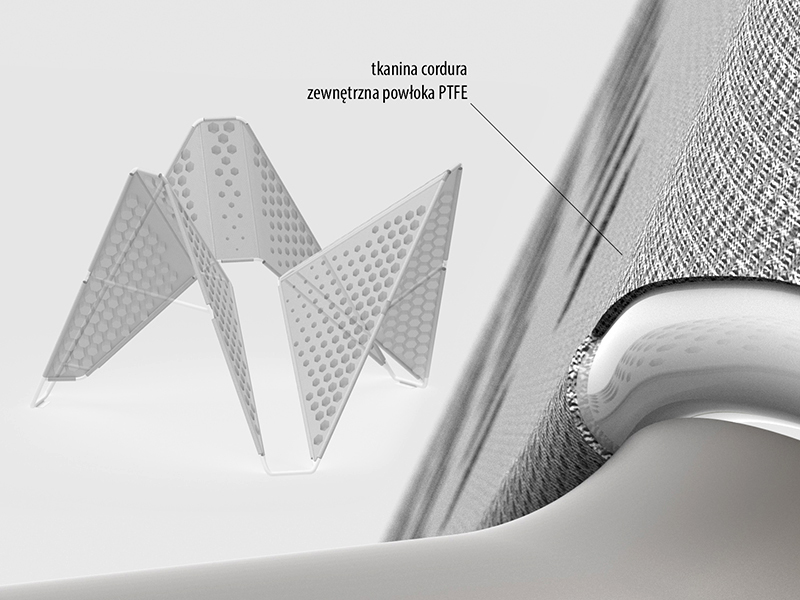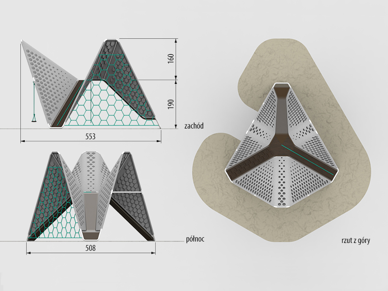 Projekt koncepcyjny „zielonego" placu zabaw jest wypadkową dwóch głównych idei: zagospodarowania zaniedbanych przestrzeni podwórzy oficyn kamienic oraz zwiększenia powierzchni biologicznie czynnej w dużych miastach. Zostały one zrealizowane poprzez propozycję niedużego obiektu, którego budowa opiera się o konstrukcję nośną, wykonaną z rur stalowych oraz tkaninę rozpostartą między nimi. Użyta tkanina to materiał o nazwie Cordura - odporny na uszkodzenia mechaniczne, sztywny, lekki i wodoszczelny. Stanowi on niejako podłoże dla roślinności, która porasta zewnętrzne powierzchnie obiektu. Dobór roślin obejmuje przede wszystkim gatunki spotykane w ogrodach skalnych, odporne na suszę i duże nasłonecznienie- trawy, berberysy, rośliny płożące. Technologia uprawy tych roślin to hydroponika, czyli uprawa bezglebowa. Tak przygotowana roślinność nie wymaga zabiegów pielęgnacyjnych. Praca przy udziale studentów Uniwersytetu Jagiellońskiego pod opieką prof. Halszki Ogińskiej.