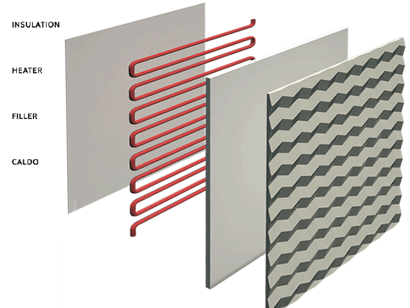 wylewamy dziecka z kąpielą. Skoro już chcemy pozbywać się pieców to przynajmniej zostawmy kafle. Tak powstał pomysł na projekt nowej formy kafla do budowania ścian grzewczych. Caldo to użycie tradycyjnej technologii do stworzenia nowej formy, gdzie punktem wyjścia jest rzemiosło, a celem współczesny design. Podjęliśmy próbę zmiany nastawienia użytkownika w stosunku do kafla oraz pokazania, że ten przyjemny, w 100% ekologiczny produkt może na nowo cieszyć emitując przyjemne dla człowieka ciepło. Caldo powstało w dwóch skalach. Jego trójwymiarowy wzór powierzchniowy, w zależności od kąta patrzenia i padania światła daje w odbiorze mnogość grafik. Faktura nie jest jedynie zabiegiem estetycznym, zwiększa powierzchnię grzewczą. Kafel służy do budowania dekoracyjnych ścian grzewczych, pieców oraz grzejników.
