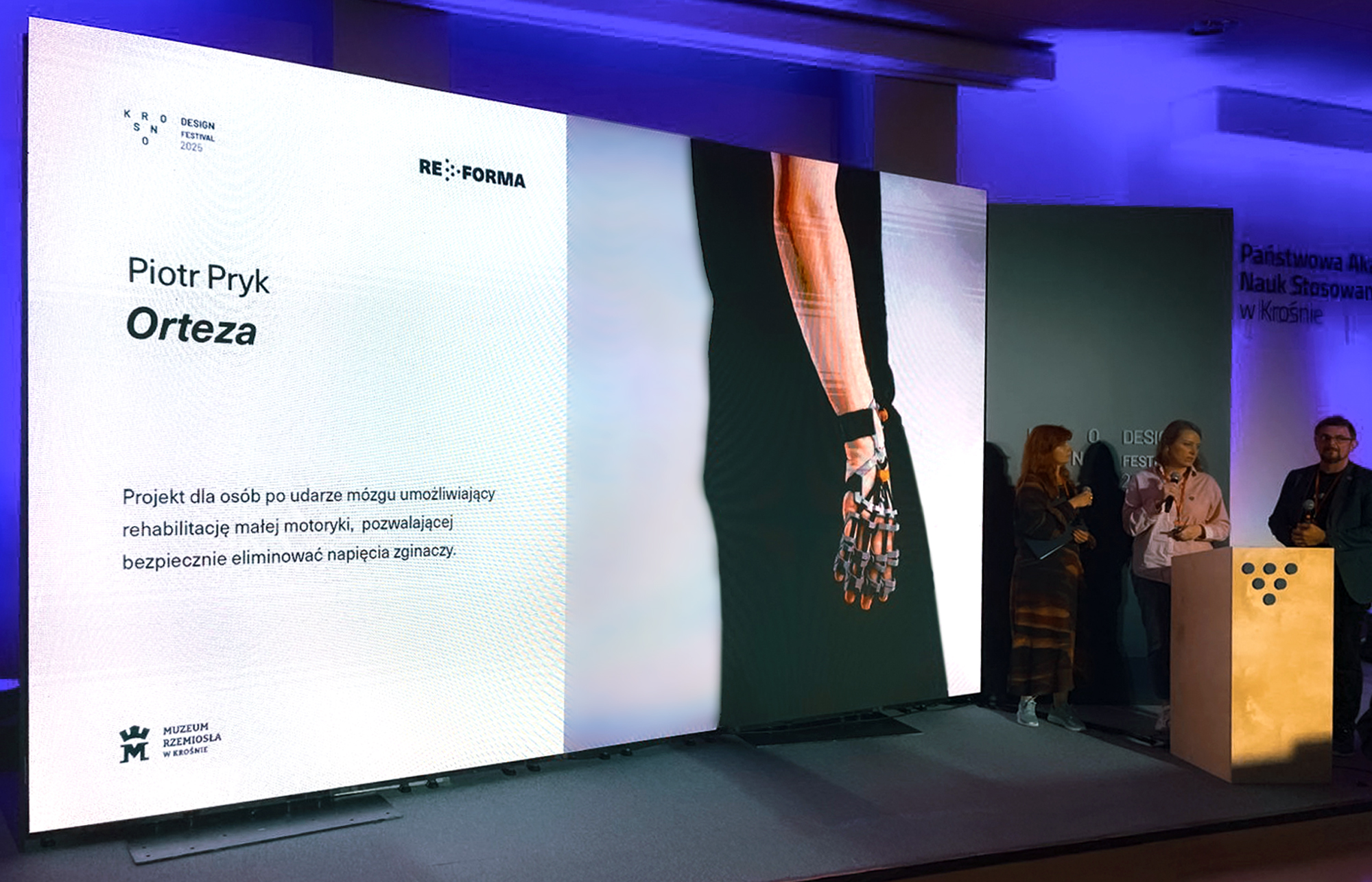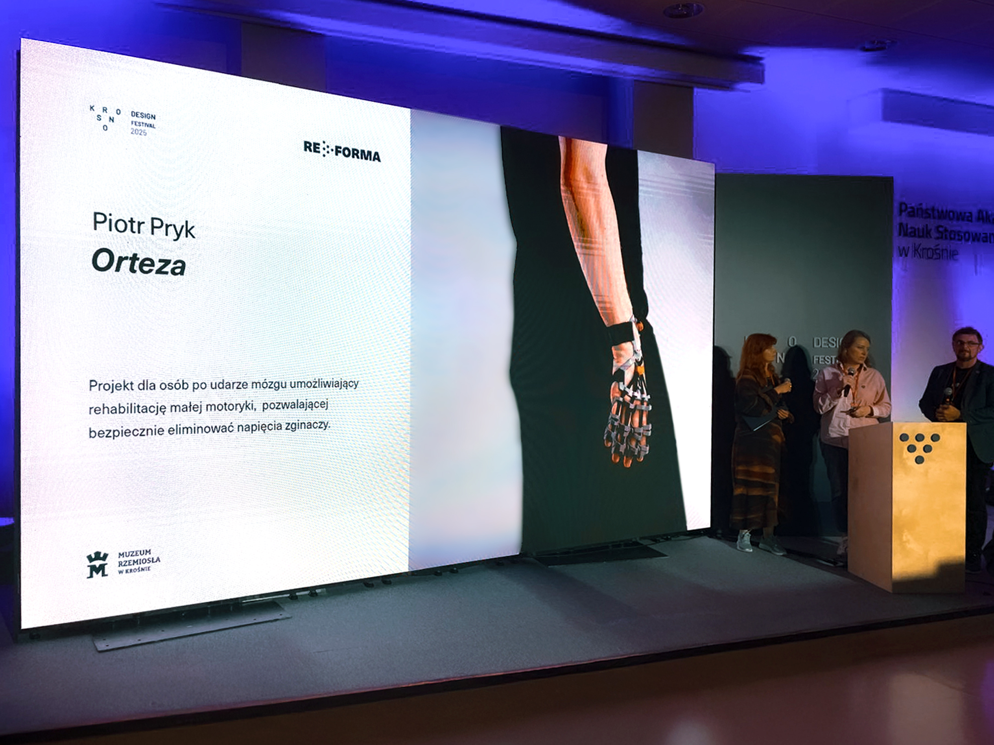 Projekt ortezy dla osób po udarze mózgu, autorstwa Piotra Pryka, zrealizowany w Pracowni Ergonomii pod kierunkiem prof. Czesławy Freilich i mgr Karola Cyrulika, został wyróżniony w konkursie RE:Forma 2025 podczas Krosno Design Festival.