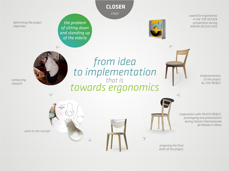 Krzesło z kolekcji 4 YOU to przykład projektowania zrównoważonego i uniwersalnego. Proste, o nowoczesnej formie siedzisko, w dyskretny sposób kryje w sobie wiele udogodnień dla osób starszych z problemem ze wstawaniem. Projekt krzesła rozwiązuje problem siadania bokiem, które jest bardzo charakterystyczne dla ludzi starszych - tzw. Siadanie kontrolowane. Wygodne siedzisko obraca się o 360 stopni pozwalając na swobodną zmianę pozycji. Oparcie zapewnia wygodne podparcie pleców a dodatkowa półka daje wsparcie przy wstawaniu.